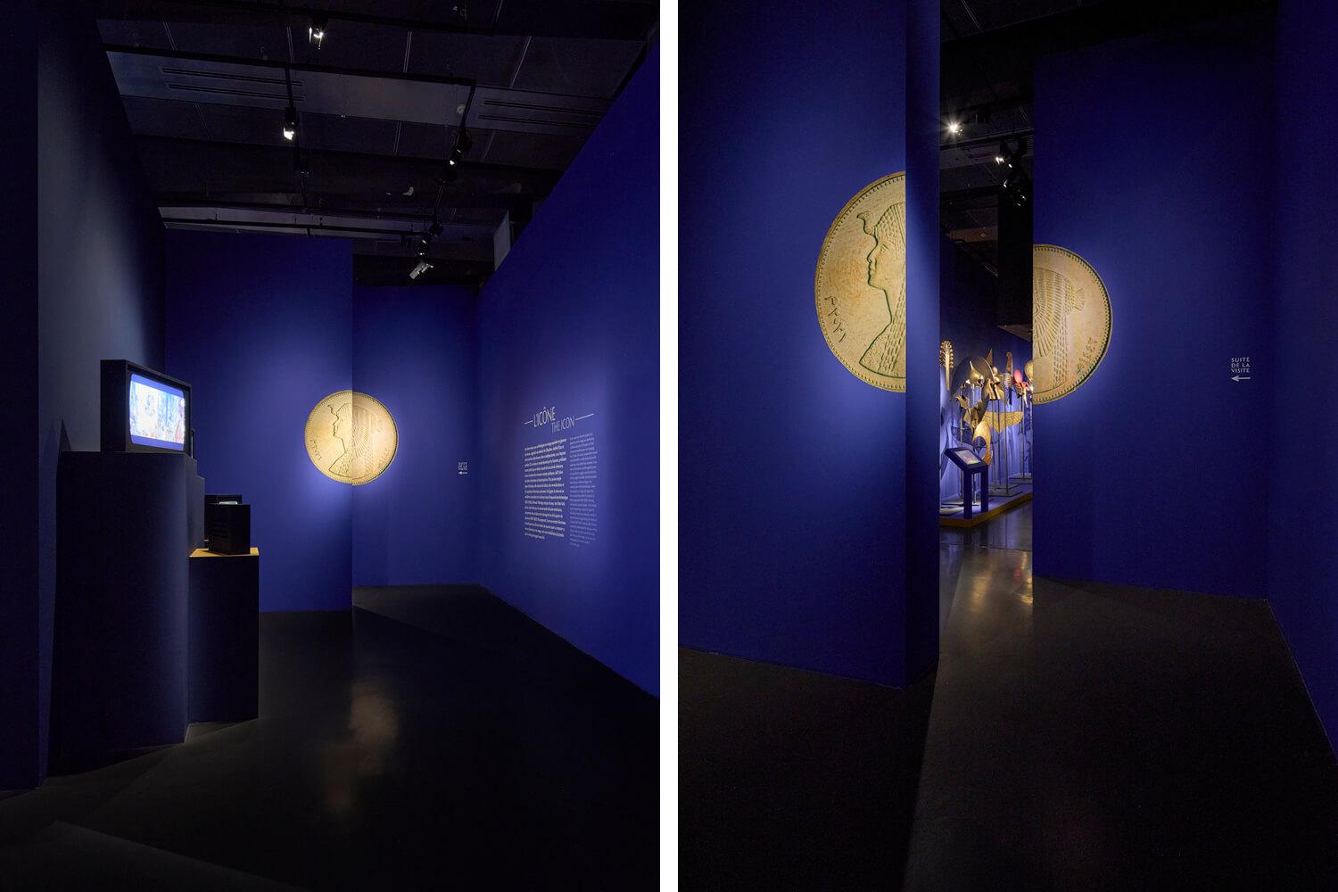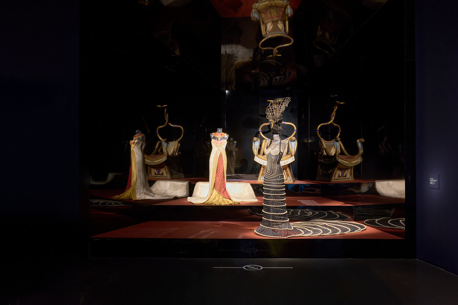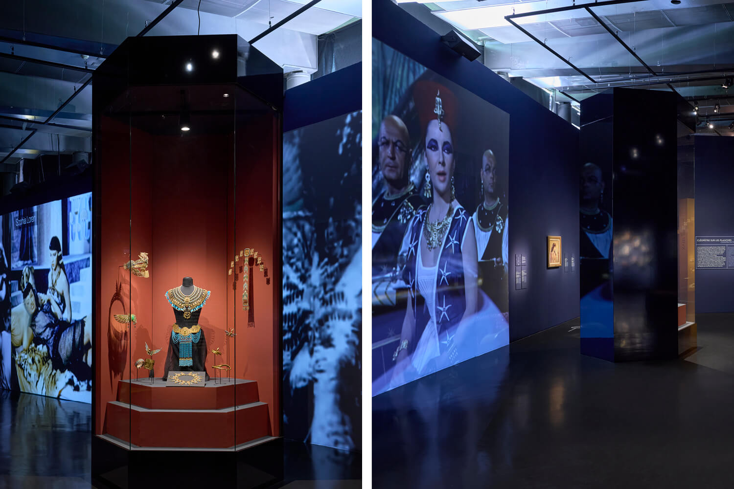 Nous travaillons donc des scénographies de facettes à miroir, comme une sorte de galerie des glaces dans laquelle toutes les images et la multiplicité des visages de Cléopâtre se reflètent et se confondent avec l’image même du visiteur et pour procurer à l’ensemble un univers glamour, indissociable du mythe et mystère Cléopâtre.
