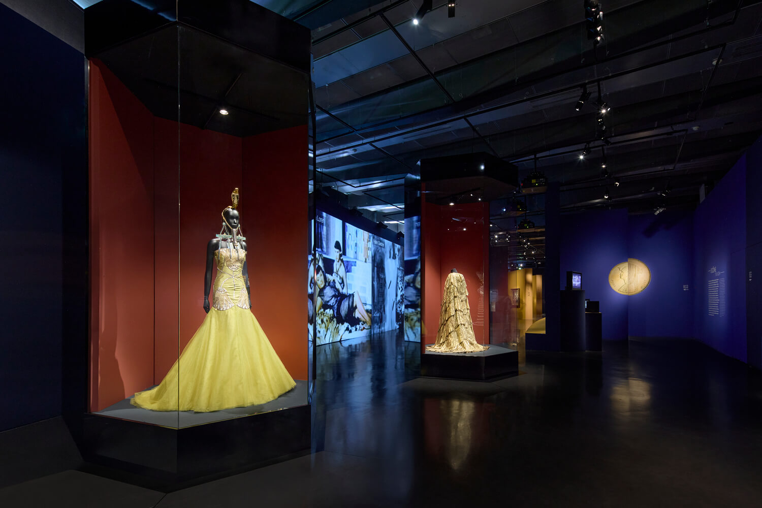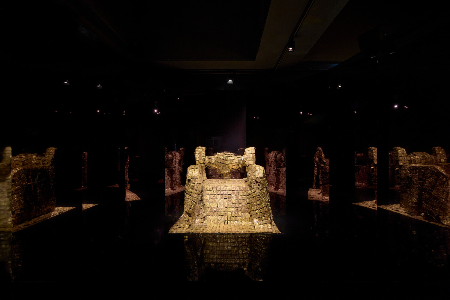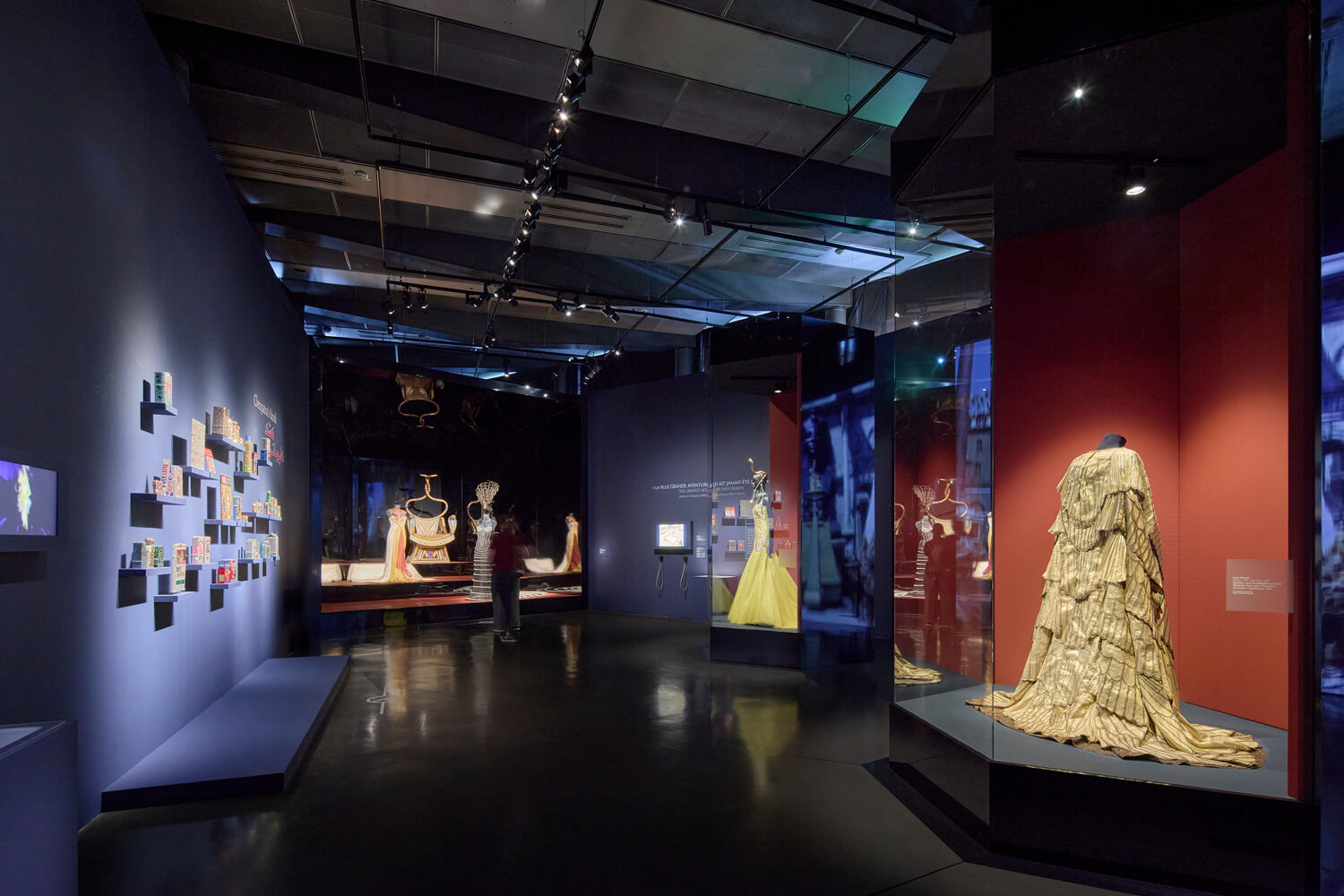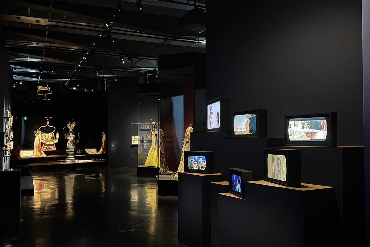 Nous travaillons donc des scénographies de facettes à miroir, comme une sorte de galerie des glaces dans laquelle toutes les images et la multiplicité des visages de Cléopâtre se reflètent et se confondent avec l’image même du visiteur et pour procurer à l’ensemble un univers glamour, indissociable du mythe et mystère Cléopâtre.